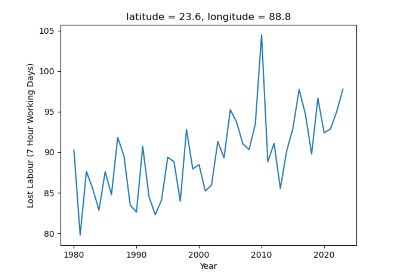 The stakeholder consultation process highlighted the trend of lost labour hours due to adverse environmental conditions as an issue of local concern. The project analysed trends for the study region in Wet Bulb Globe Temperature (WBGT), a heat metric that considers air temperature, relative humidity, wind speed and direct solar radiation - factors that determine how much heat a person experiences and their ability to cool down through sweating. It is a metric that has been found to be a stronger predictor of negative heat-related health outcomes than air temperature or the heat index (a combination of air temperature and relative humidity). It is also used in national legislation and workplace health and safety. The analysis showed a clear upward trend over the past 3 decades in the amount of time workers would be recommended not to work to stay within safe physiological boundaries.