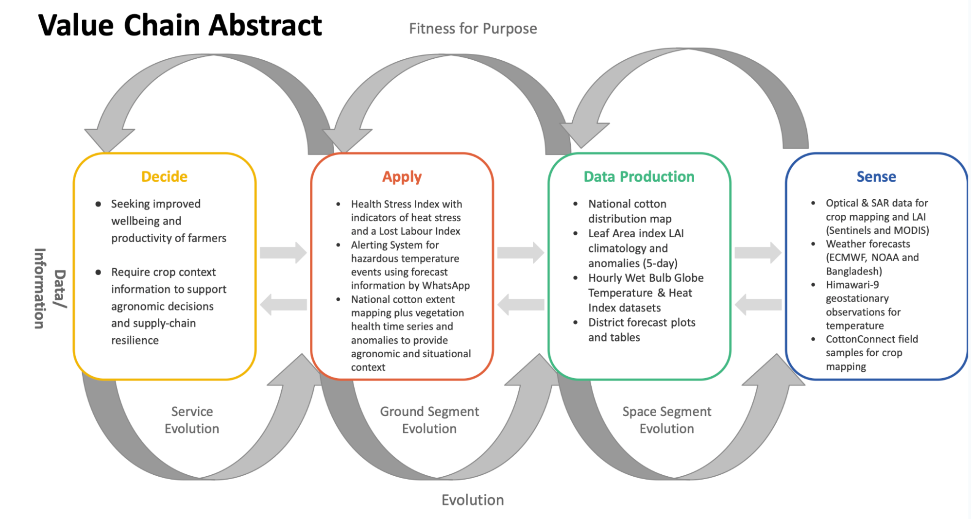 C5 is an agroclimatic advisory solution designed to help cotton communities adapt to climate change by combining satellite Earth observation (EO) with climate reanalysis and forecast data. The feasibility study in western Bangladesh (Kushtia, Meherpur and Chuadanga) produced a prototype service that translates complex weather and EO-derived indicators into simple, actionable guidance for farmers and the support organisations that serve them. The core innovation is an explicit focus on farmer health and labour productivity under extreme heat, alongside crop context information to support agronomic decisions and supply-chain resilience.